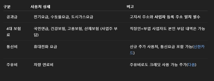 *통신비와 주유비도 사용 가능 항목으로 추가된 최신 업데이트 반영