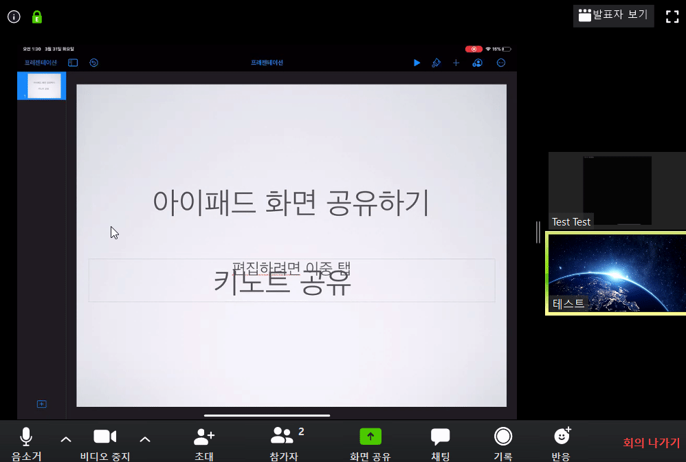 입력 후에는 위와 같은 화면이 뜹니다. 화면이나 키노트 공유 방법은 앞에서 설명을 드렸습니다. 참고해주세요.